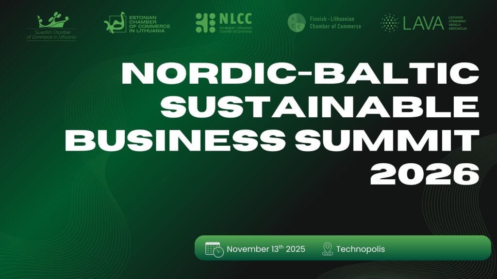 For the 13th time, the Swedish, Estonian, Finnish, and Norwegian Chambers of Commerce in Lithuania, together with the Lithuanian Responsible Business Association (LAVA), are proud to present the Nordic-Baltic Sustainable Business Summit — a platform where business leaders, policymakers, and innovators come together to turn sustainability from a vision into action.